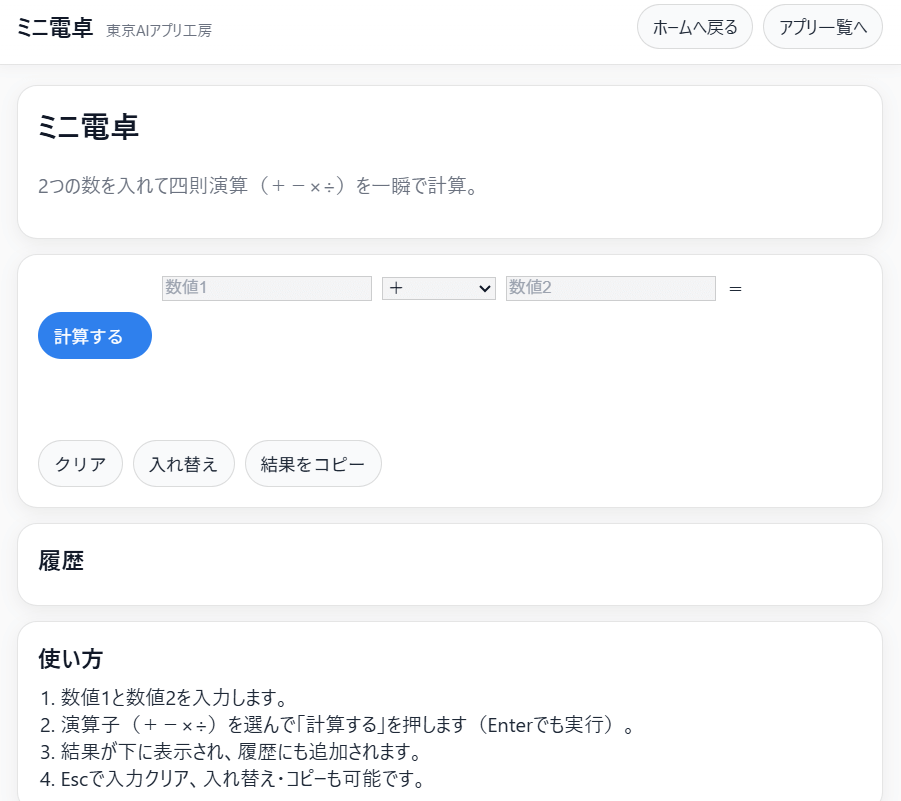 - フォーム型UI:数値入力×2+演算子セレクト → 「計算する」で結果表示